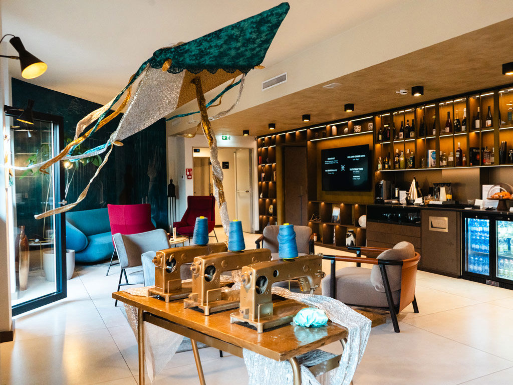 Riesci a liberare la mente dai pensieri ordinari? Questo è l’invito di Alessia che, con la sua installazione site-specific, parla in modo nuovo agli ospiti in visita all’AXYHOTELS InnStyle per la Settimana della Moda 2025.